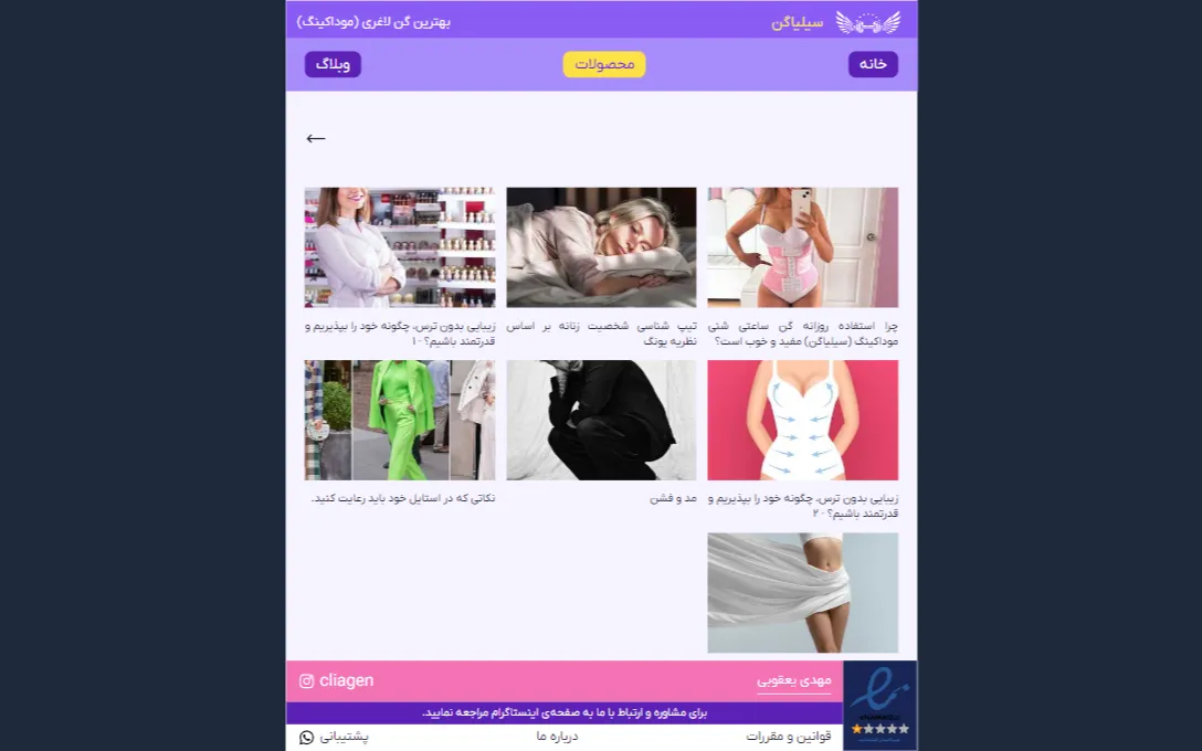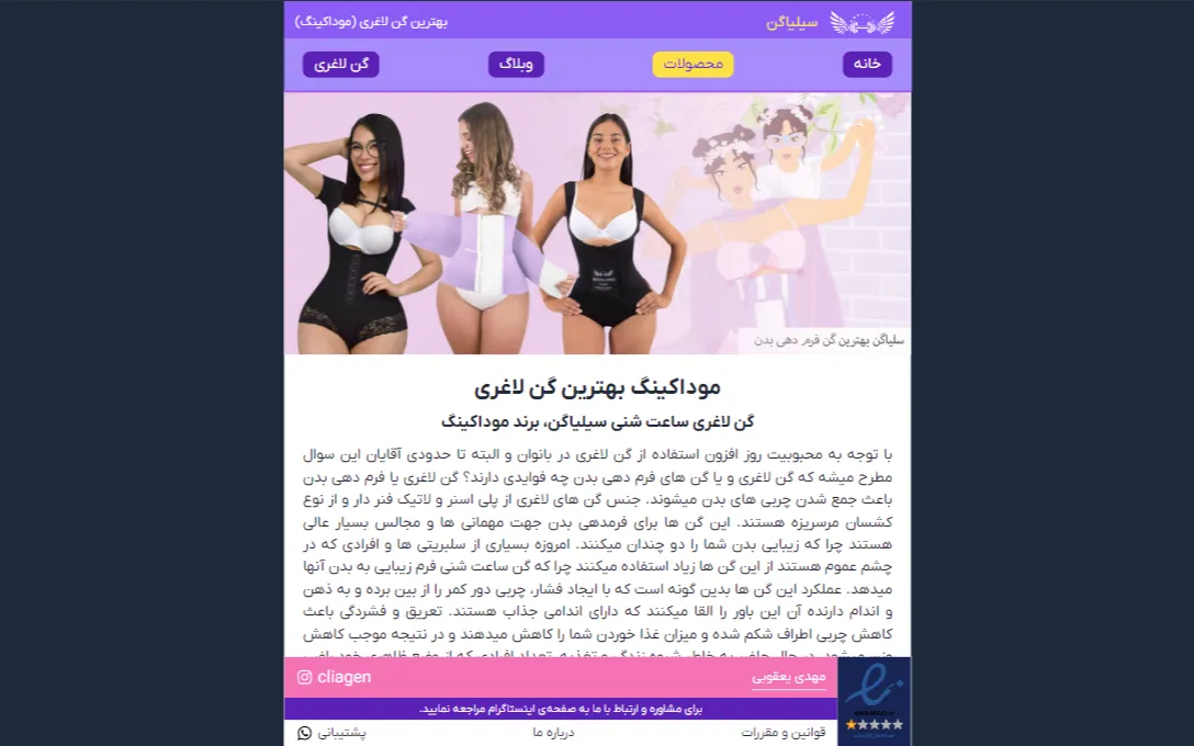 طراحی وبسایت برند «سیلیاگن» با هدف فروش آنلاین انواع گنهای لاغری انجام شده است. این سایت بهصورت اختصاصی برای معرفی و فروش محصولات فرمدهنده بدن طراحی شده و تجربه خرید سریع و آسان را برای کاربران فراهم میکند.