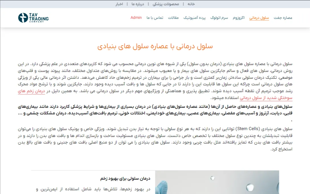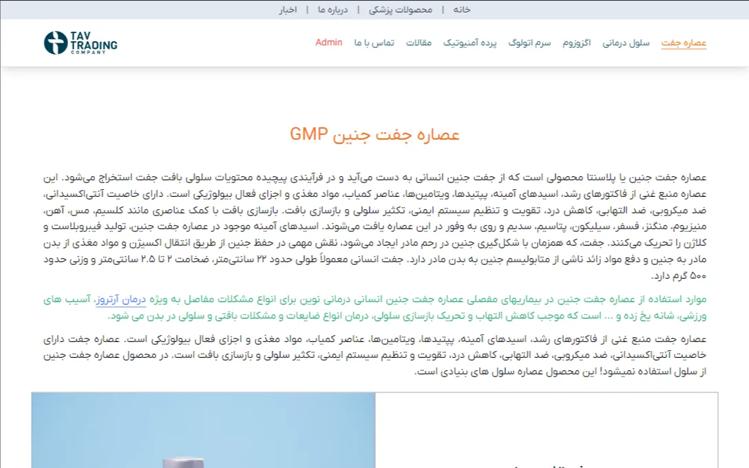 طراحی سایت و سئو شرکت همراه تجارت تاو. این سایت ارائه کننده محصولات پزشکی است و هدف اولیه آن سئو و حضور با کلمات کلیدی هدف در صفحه اول گوگل بوده است. اکنون سایت بر اساس کلمات کلیدی خانواده "عصاره جفت" در صفحه اول گوگل است و این سئو تکنیکال در عرض 3 ماه طراحی و اجرا و به سرعت به نتیجه رسیده است. وب سایت دارای ادمین اختصاصی برای مدیریت وبلاگ و اخبار است.